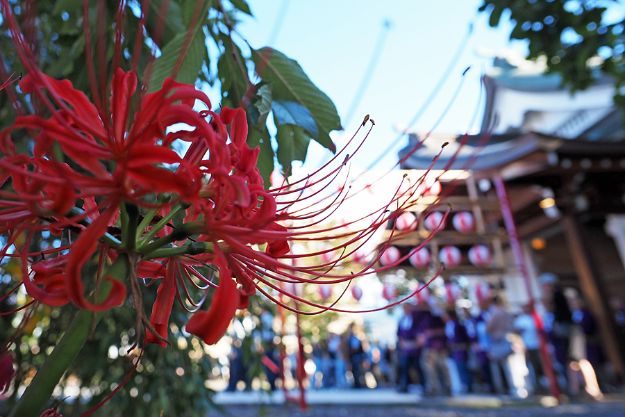 ![]() 今日ばかりは日陰の花となってしまった彼岸花。 参道に並んだ紅白の提灯にツンツンとちょっかいを出している。 |
