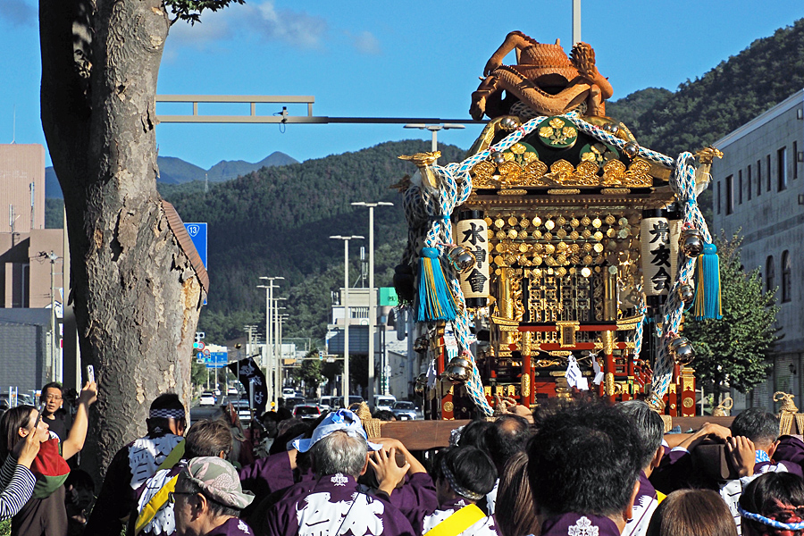 ![]() 真新しいとぐろ巻く竜をてっぺんに乗せ、 神輿は奥羽の山並みを向かい合う。 |