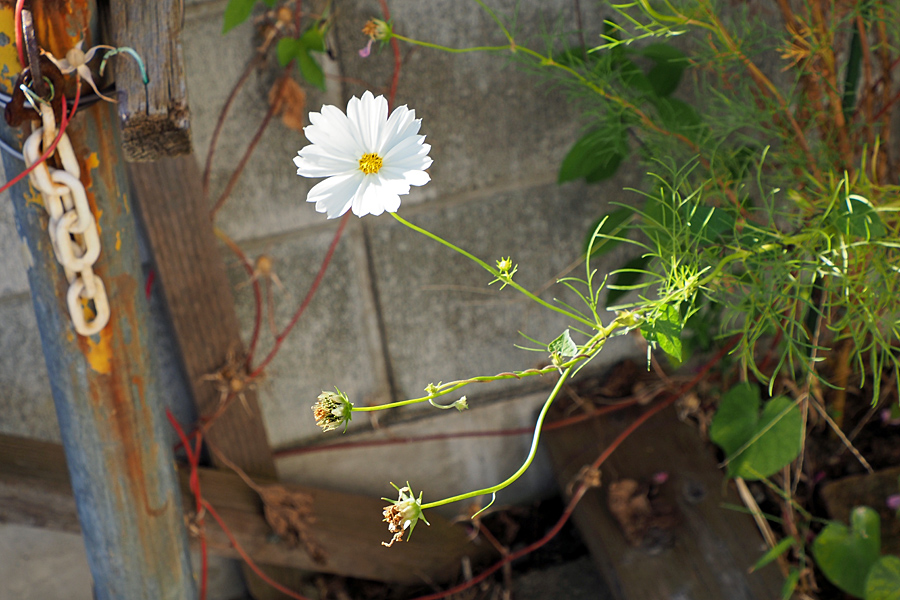 ![]() うわーっと一面に咲くコスモスもいいけれど、 こんな風にはぐれてしまった一輪を愛おしむのもいい。 「木っぱずどが錆びだパイプの中で咲く姿なの切なさまで感じさせんもなぁ」 |