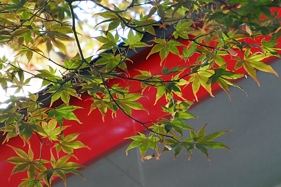 ![]() 「おもしゃいべぇ?」 「何が?」 「んだて柱が赤くて紅葉が青いんだじぇ」 まだまだ柱の色に紅葉が同化するには早すぎる。 |
