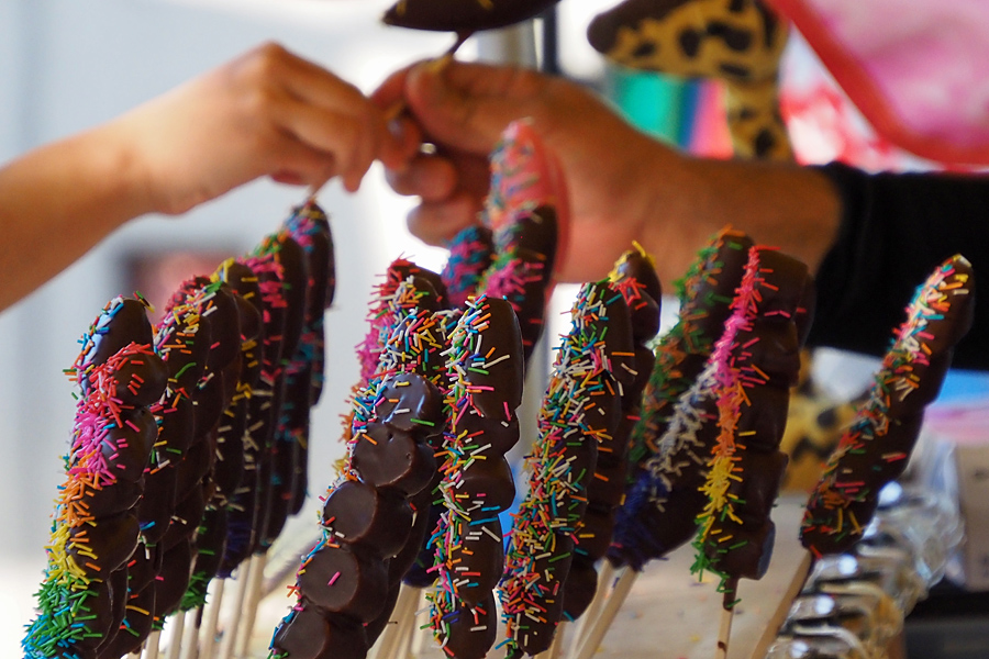 ![]() 棒立ちの群れの上を手が行き来する。 チョコを塗られ派手な色に飾られたバナナたちは、自分の順番を見上げながら待つ。 |
