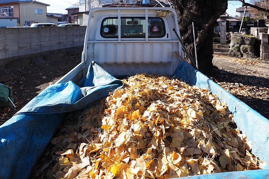 ![]() 「しゃますさんなねな」 軽トラは背中に銀杏の葉っぱが山ほど。 ギンナンも混ざっているから、どこへ運んでも臭い顔をされるのは間違いない。 |