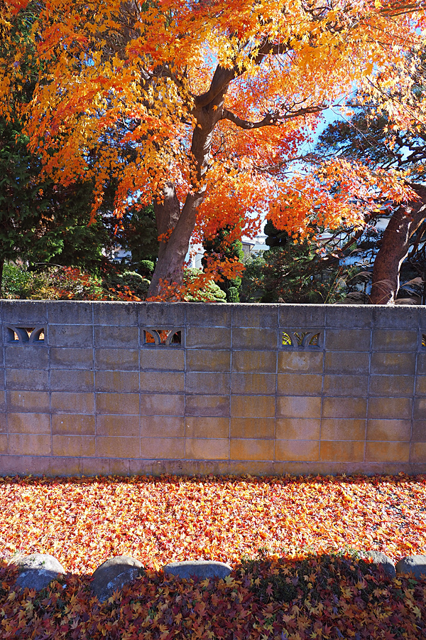 ![]() 「オーマイガー!」 欧米ミステリー文学好きな私は思わず叫んでしまった。(ちょっとつかしてみました) 舞い降りた紅葉の葉っぱは塀までもうっすらと赤く染めている。 |