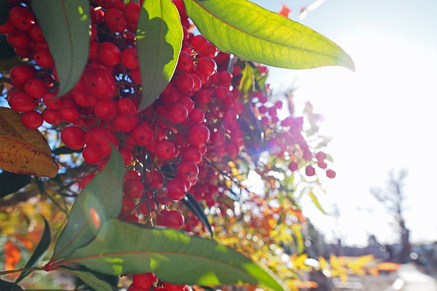 ![]() 太陽の光は低い位置にあるものの、その光りは力強い。 葉っぱの葉脈は透き通り、赤い粒粒も光りに溶け込んでしまいそうだ。 |