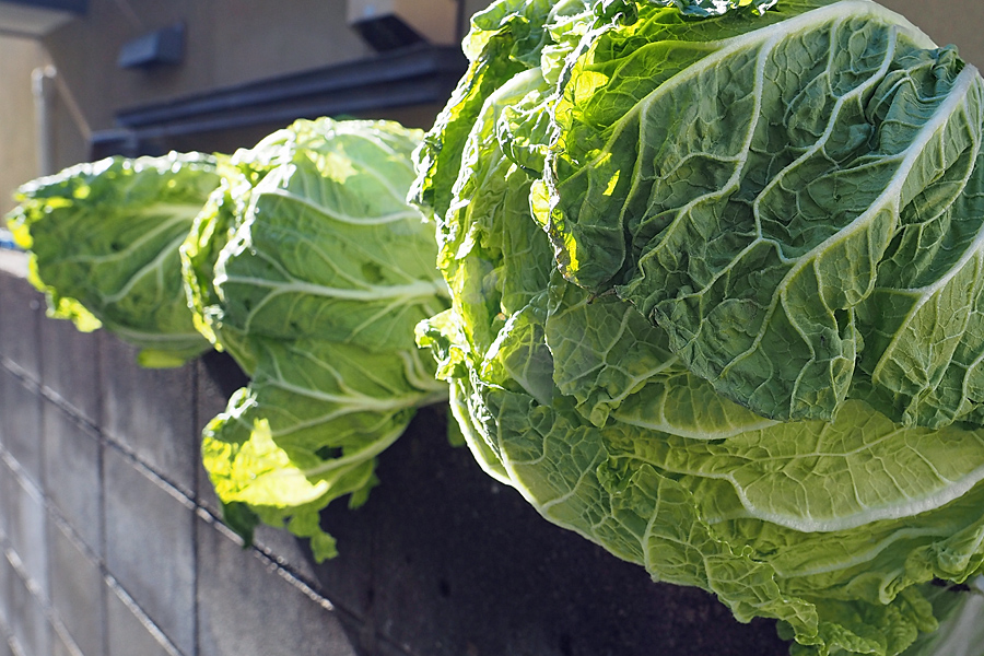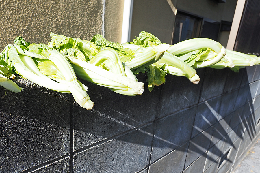 ![]() 「路地の楽しみはこれよ、これ!」 白菜はコンクリ塀に載せられ、その葉脈はミャクミャクと鼓動を伝えてくるようだ。 |
