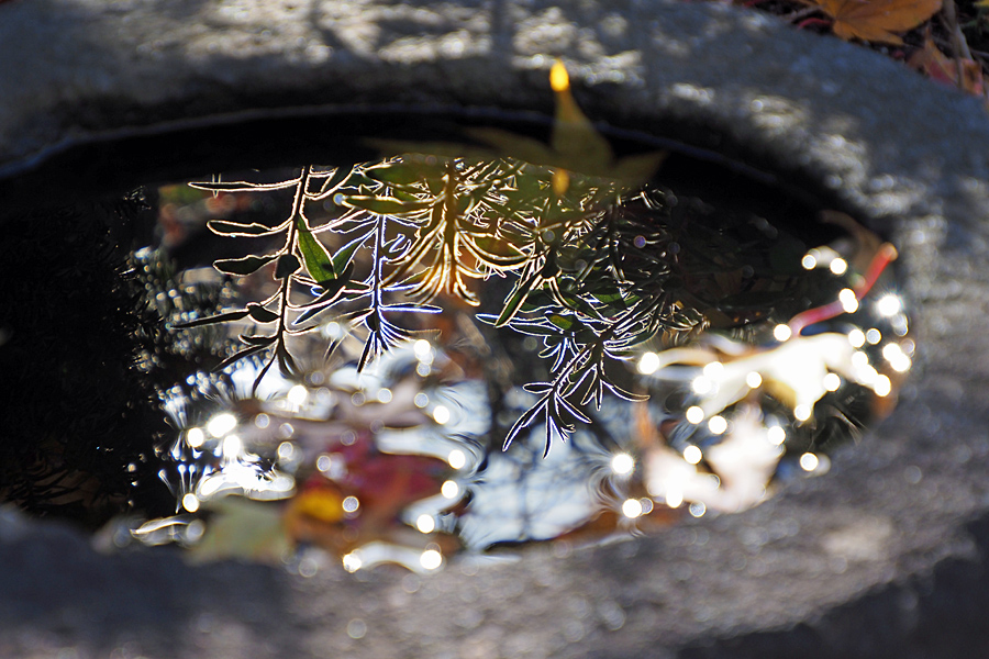 ![]() お寺さんが散在する七日町。 ひょいとつくばいを覗けば、水面では産毛の浮き上がった草が光りの粒と遊んでいる。 「霜で凍えでるんだど思たらんねんだっけな。この季節だがらよぅ」 |