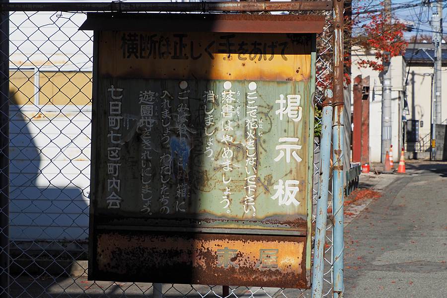 ![]() 「なにすんな、かにすんなて書いであっげんとも結局構ってもらうだいのよぅ」 錆の進んだ看板は小言をいうことで自分を元気づけ、そして周りと繋がりたい。 |