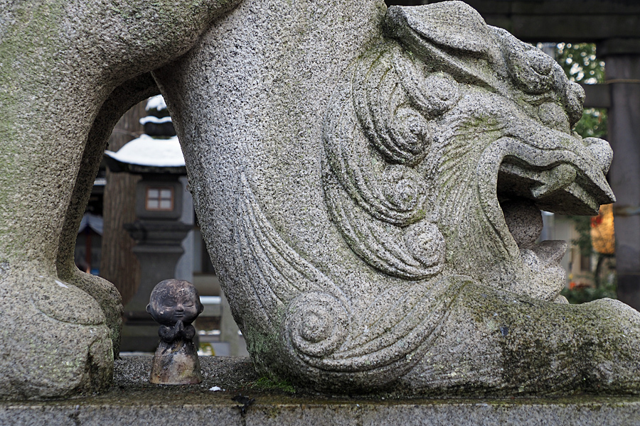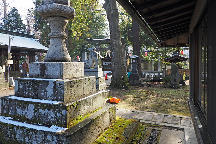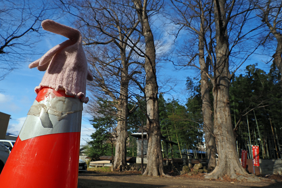 ![]() 「参拝する前から目立づごどなぁ、混雑してっから早ぐ帰れてがぁ」 ケヤキの落ち葉の絨毯へちょこんと立って、初めて与えられた仕事のように張り切っている。 |