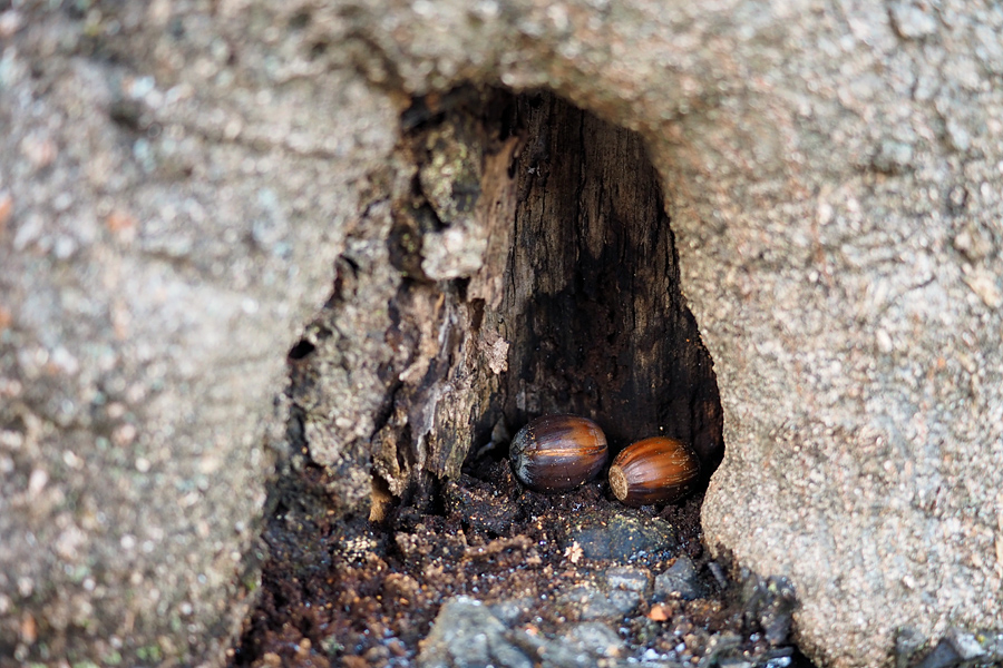 ![]() ケヤキのウロに二匹のどんぐりが身を縮こまらせてこちらを伺っている。 母親が早く餌を持ってきてくれないかと待つように。 |