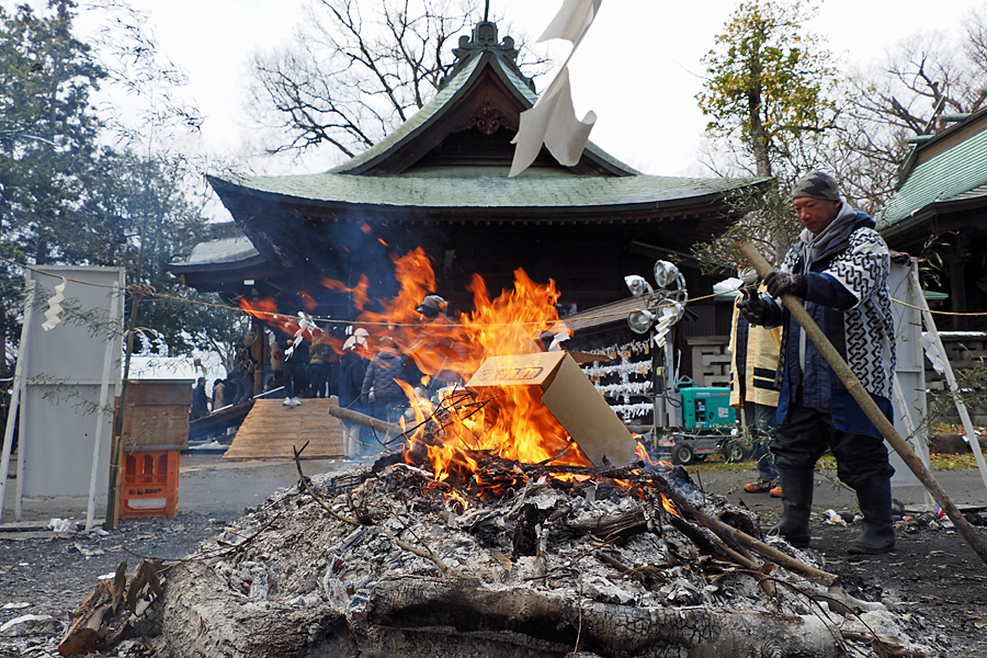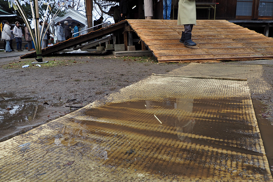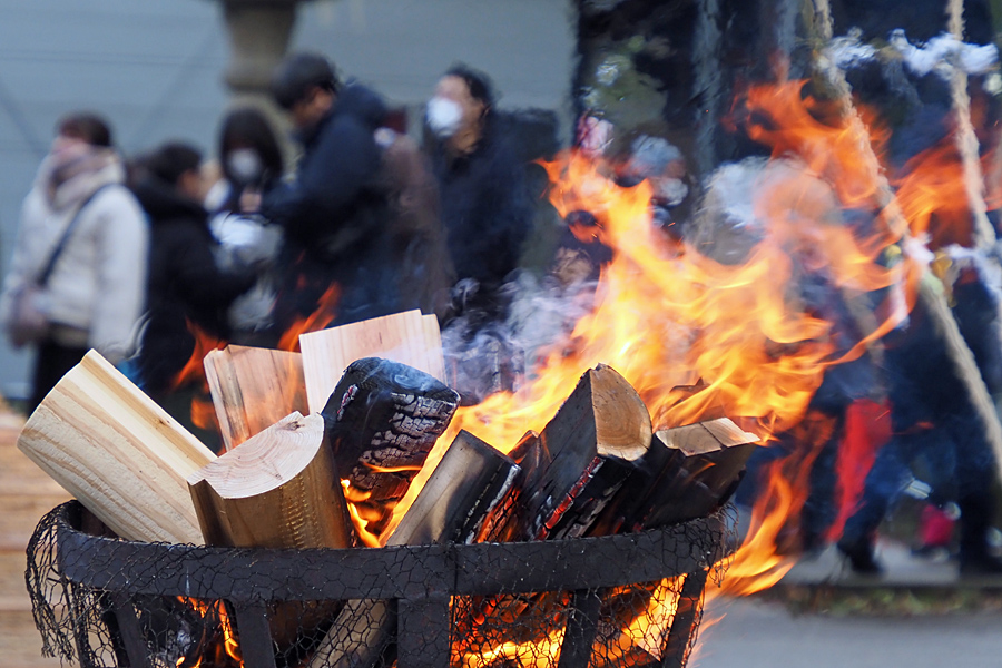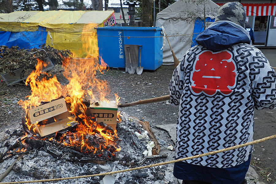 ![]() 篝火の向こうには拝礼待ちの人々がズラリ。 四列に並んで進んでくださいという案内看板に従って人々はとろとろと拝殿へ進んでいく。 「拝礼は受け付けっげんと、神様の気分により願い事成就に遅配の生じる場合がございます。 ていうお知らせも必要だんねべが」 |