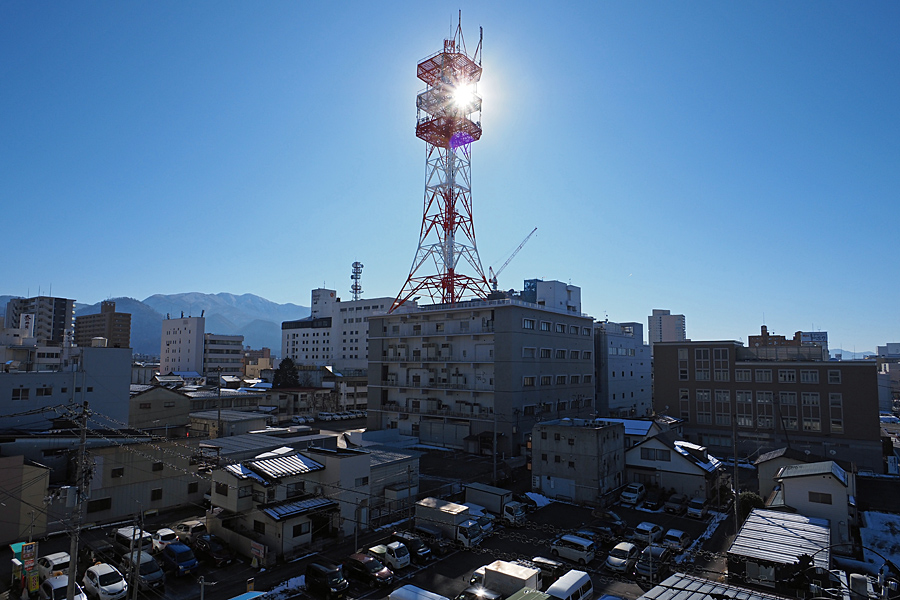 ![]() NTTの塔に太陽が被さっている。 太陽はなんという青空を山形にもたらしてくれたのだろう。 初市に向け気を利かせてくれたに違いない。 |