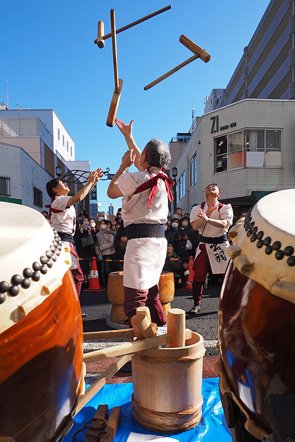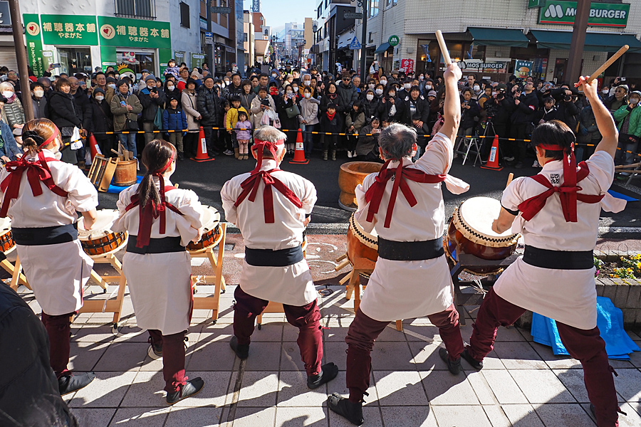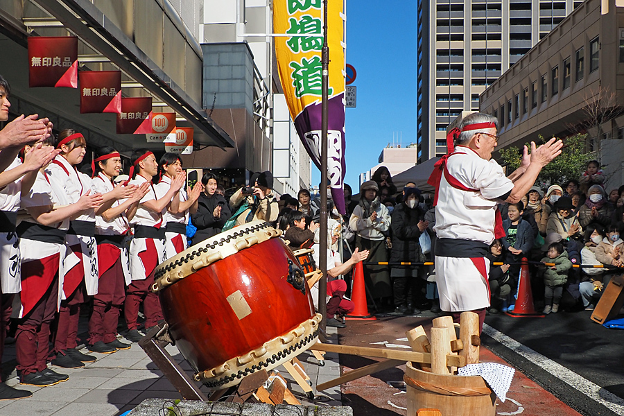 ![]() 衆目が太鼓に注目する。 いよいよ初市の景気づけに太鼓の音が青空に響くぞー。 |