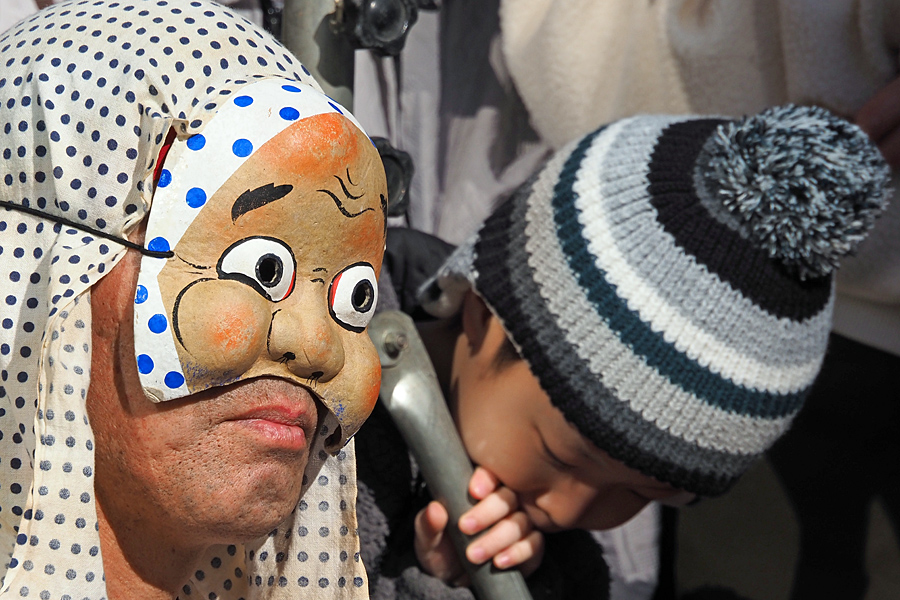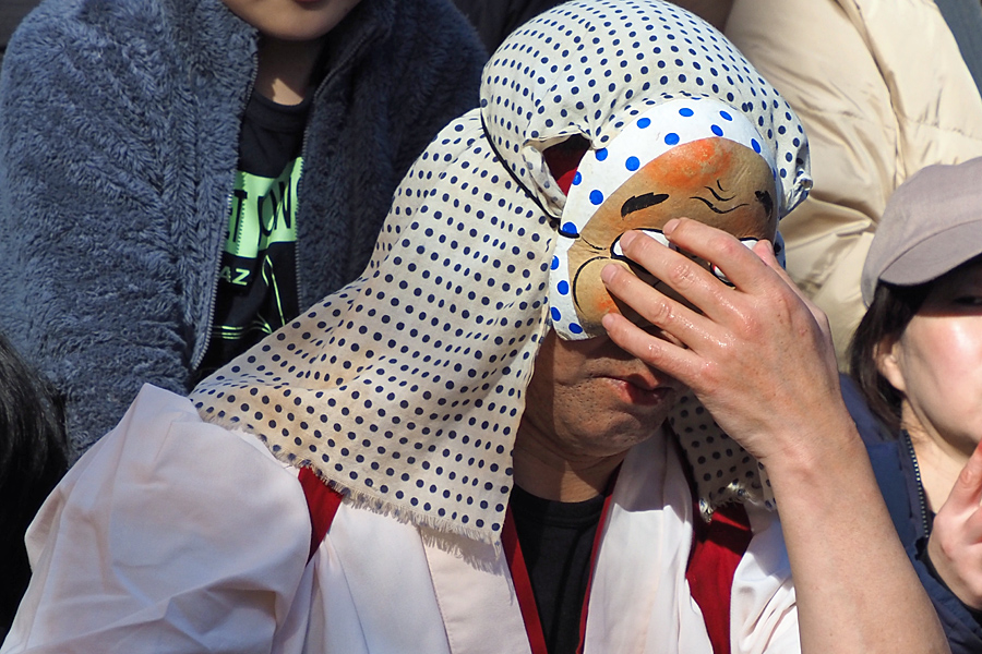 ![]() 親の笑顔で子供を見守る。 子供はおがぐらの口の中を覗いて、 誰か中にいると気づいても気づかない振りをする。 |