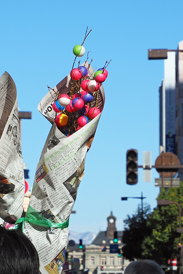 ![]() 「山形ば盛り上げっべぇ!」 皆にこやか、皆興奮、皆今年を明るくと願い、三三七拍子。 もちろん太陽もビルの隙間から燦燦七拍子。 |