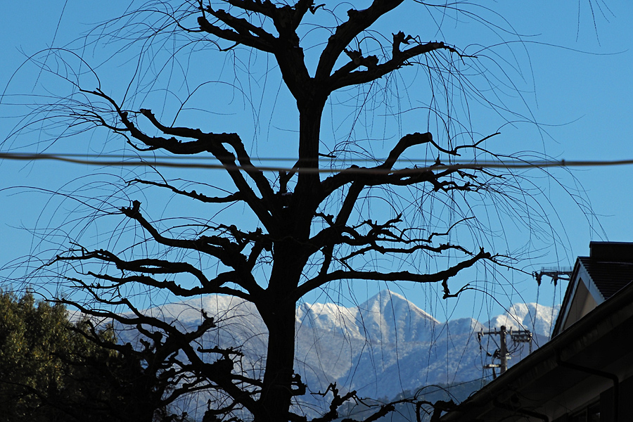 ![]() 空に張り巡らされた細くしなった枝の向こうに雁戸山。 その尖がった形は山形人の目に焼き付いている。 |