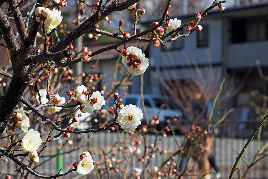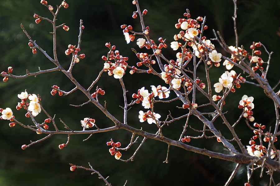 ![]() 「なんだてこっちではこだい咲いっだんだどりゃあ」 暗がりを背景に日差しの当たる場所では踊るように咲いている梅たちよ。 |
