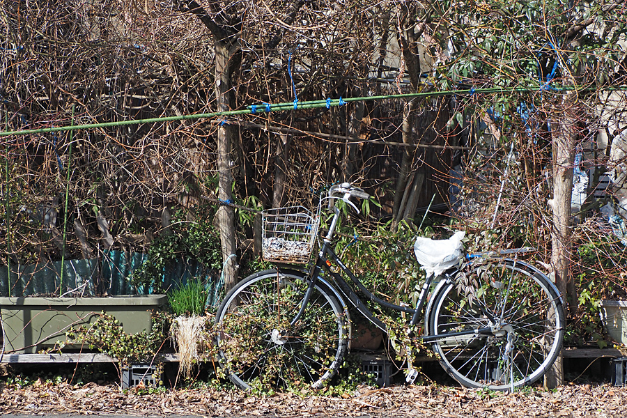![]() さてこの中にはどんな乗り物が隠れているでしょうか? そんな問題を出したくなるほど自転車は枯れ枝や草たちに馴染んでしまっている。 |
